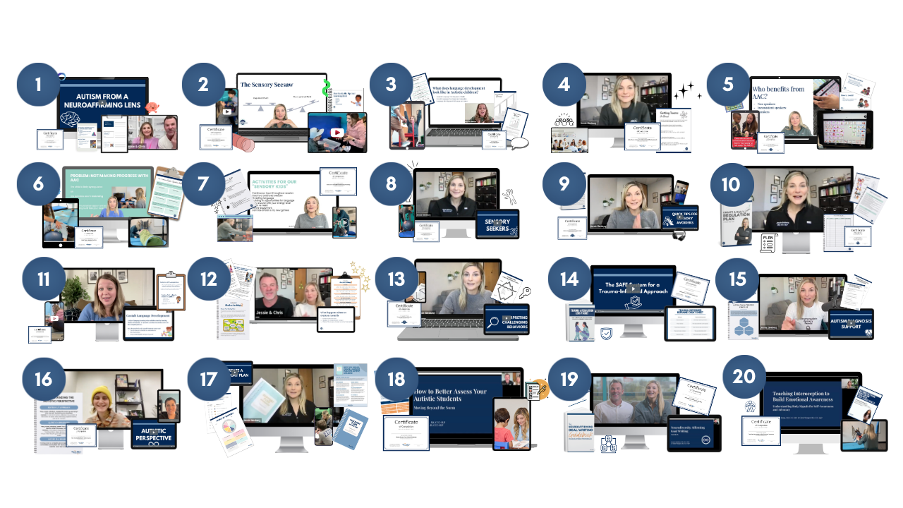 The NeuroAffirm Therapy Academy covers everything you need to be a neuroaffirming therapist including AAC, Sensory, Gestalt Language, Emotional Regulation, Coaching & Consulting, Strengths-Based Assessment, Goal Writing, and Getting Teams on Board, and more!